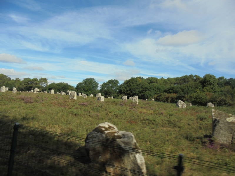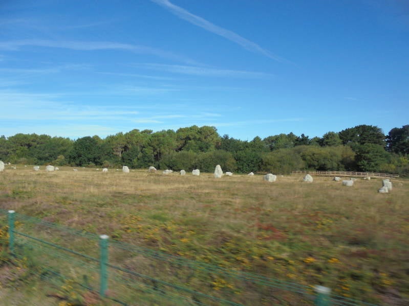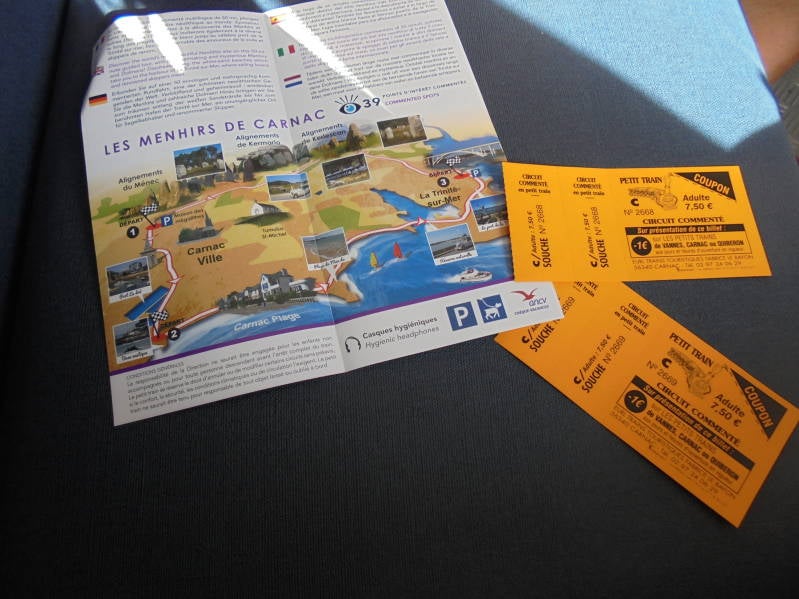 In Carnac met het touristentreintje rondrit van een uur gemaakt,langs de menhirs,dolsmen en ook langs de zee-kant van het dorp. Erg leuk! Je krijgt nl. tekst en uitleg in de taal van je keuze,via een head-set,die je kunt programmeren op 16 verschillende talen. Werkte prima!