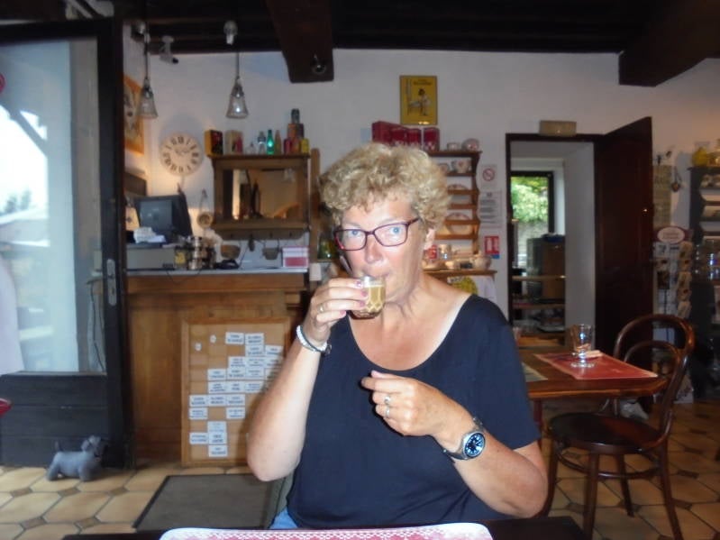 Gevonden en toen we op het terras zaten kwam hij eraan in de auto. Er naartoe gelopen en gevraagd om een foto...hihi... Hele rustige ,aardige man! Koffie met taart natuurlijk! Dorpje op zich, ziet er ook erg aantrekkelijk uit.