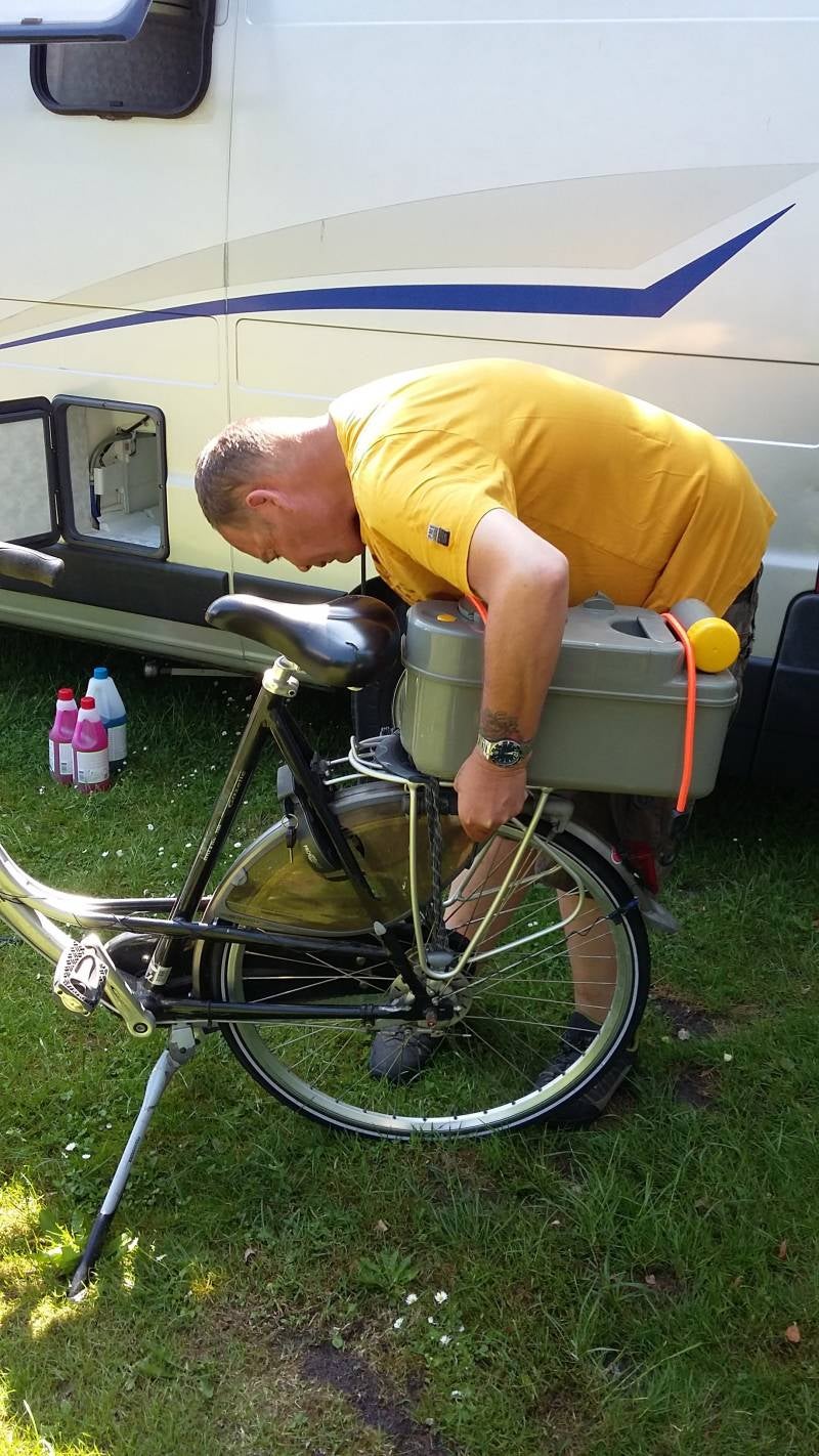Toilet vol! Gebeurt ook,he?! Het is ongeveer 150 m. lopen vanaf onze plek naar de loosplek...dat kan dus beter achterop de fiets...wel goed vastzetten met rekkers! Peter gaat ervoor!
