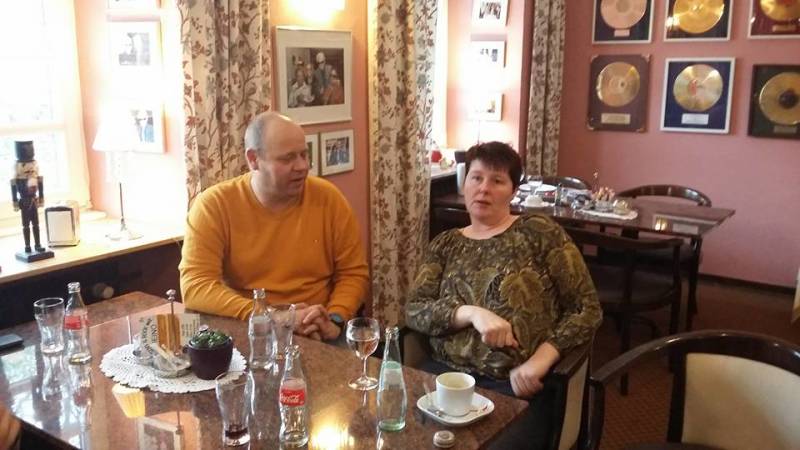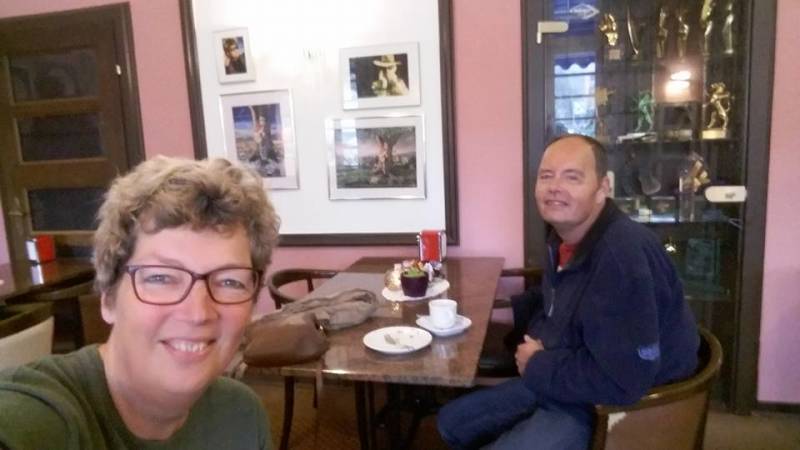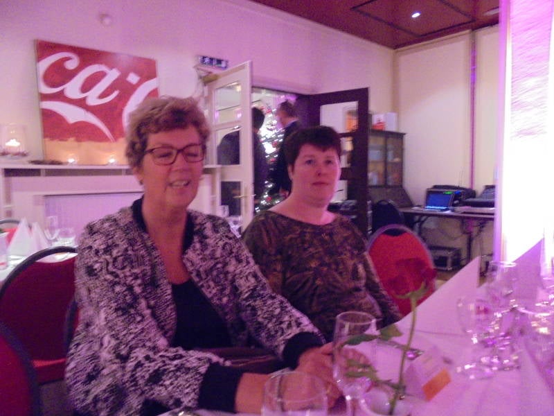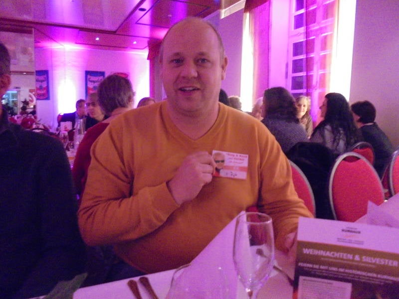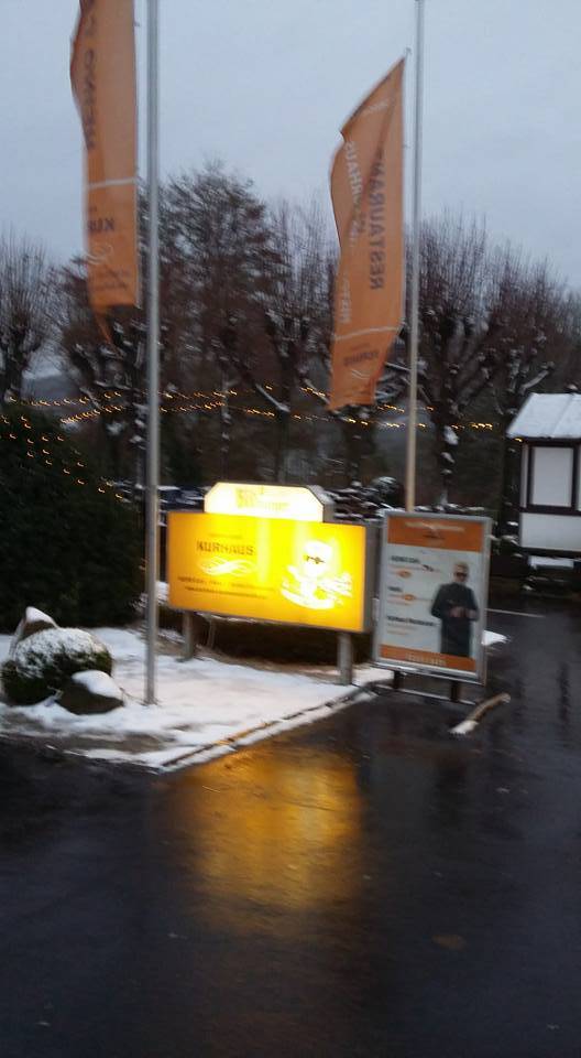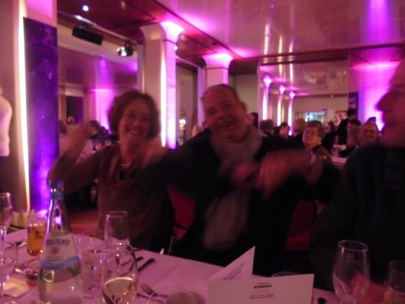 Nou,nadat we smiddags eerst Peter zn broertje en vriendin en hun vrienden hadden ontmoet, en samen met hun in Heino's cafe (in zn Kurhaus) koffie met taart hebben gehad, gingen zij terug naar het stadje beneden, naar de kerstmarkt. Wij gingen naar de parking tegenover het Kurhaus,naar de camper,waar Peter even ging liggen. Toen we ons hadden omgekleed, tegen uur of 16.15 uur, gingen we terug naar het Kurhaus,waar de anderen ook kwamen.